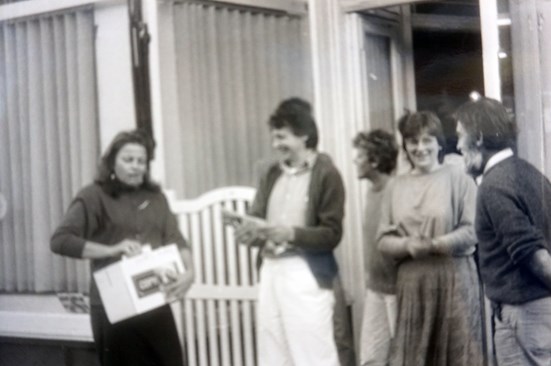 Bookspeed, Hamilton Place in the early days. A 1987 prize draw for customers, with a vegan fruit cake as a prize, won by Mushroom Bookshop, Nottingham. Pam Smith of Polygon Books drew the winning entry out of the hat.