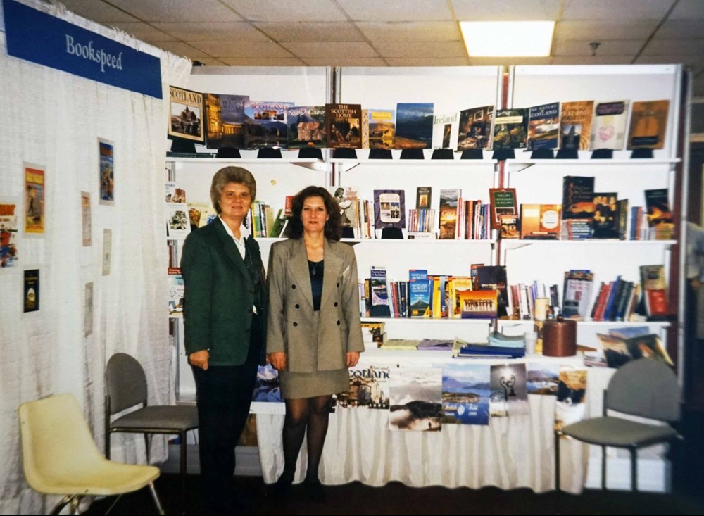 An early trade show for Bookspeed in New Jersey, USA in 1996. Yvonne Brady and Lesley Rennie on the stand during a brief foray into the North American market.